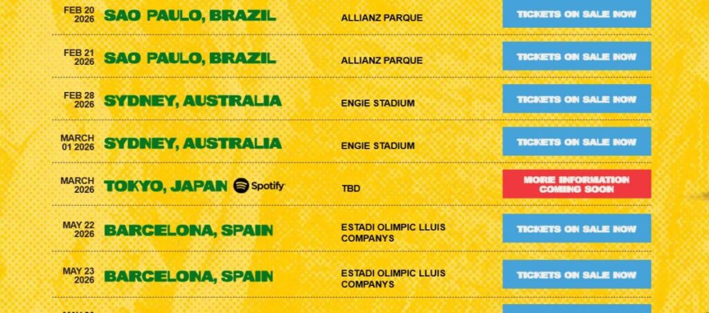 • “ワールドツアー=スタジアム級”として語られている(海外イベント情報でも同様の書き方)